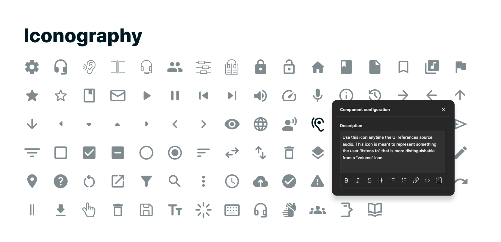 Iconography was also standardized, as icons frequently represent key concepts such as “target language” and “source audio.” While some individual selections could be refined, establishing a consistent set strengthened meaning across contexts and reduced ambiguity. Clear naming conventions and component descriptions helped communicate intended usage to the development team.