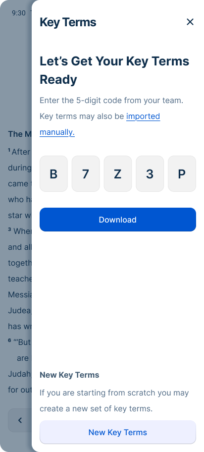 Key Terms are shared across multiple people within a team, which means it needs a simple way to distribute. A 5 digit code was used as an easy to share identifier.